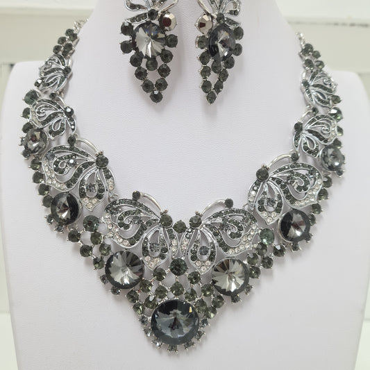 Grey Butterfly Rhinestone Necklace Set