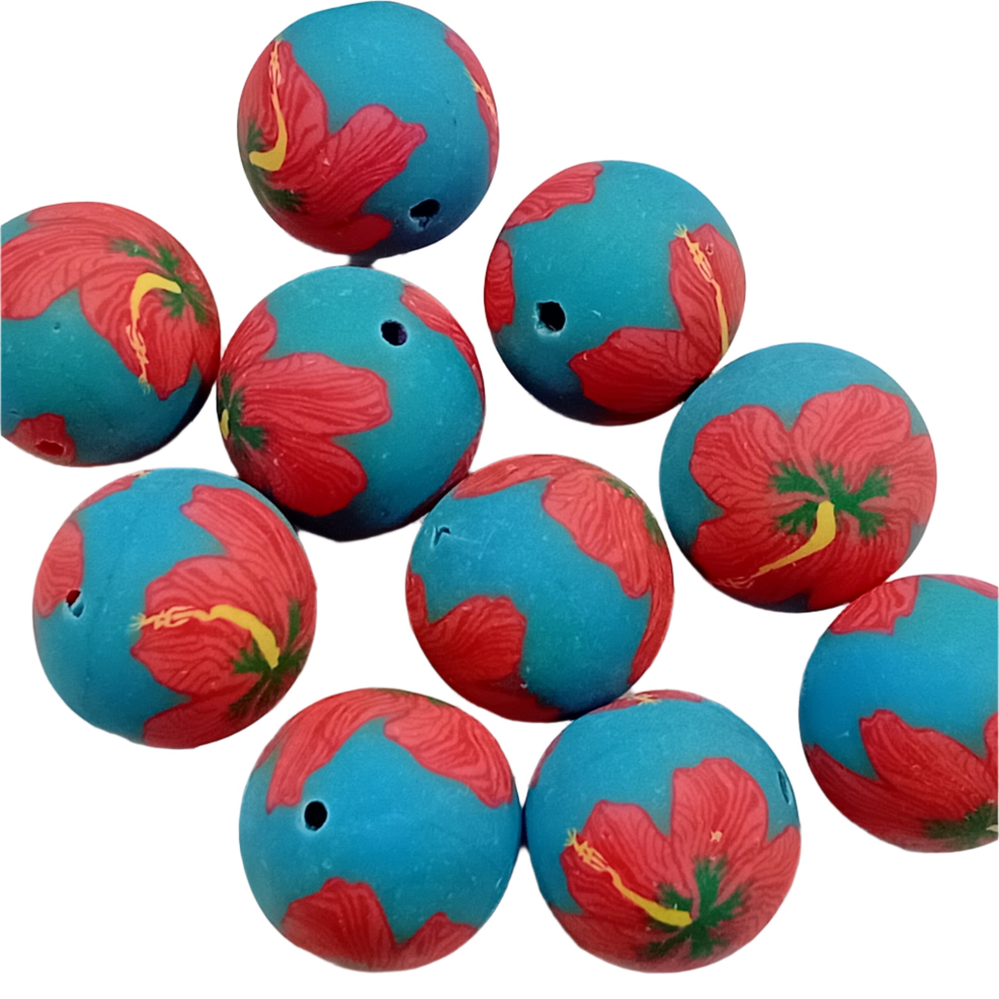 18mm Blue & Red Floral Handmade Polymer Clay Beads