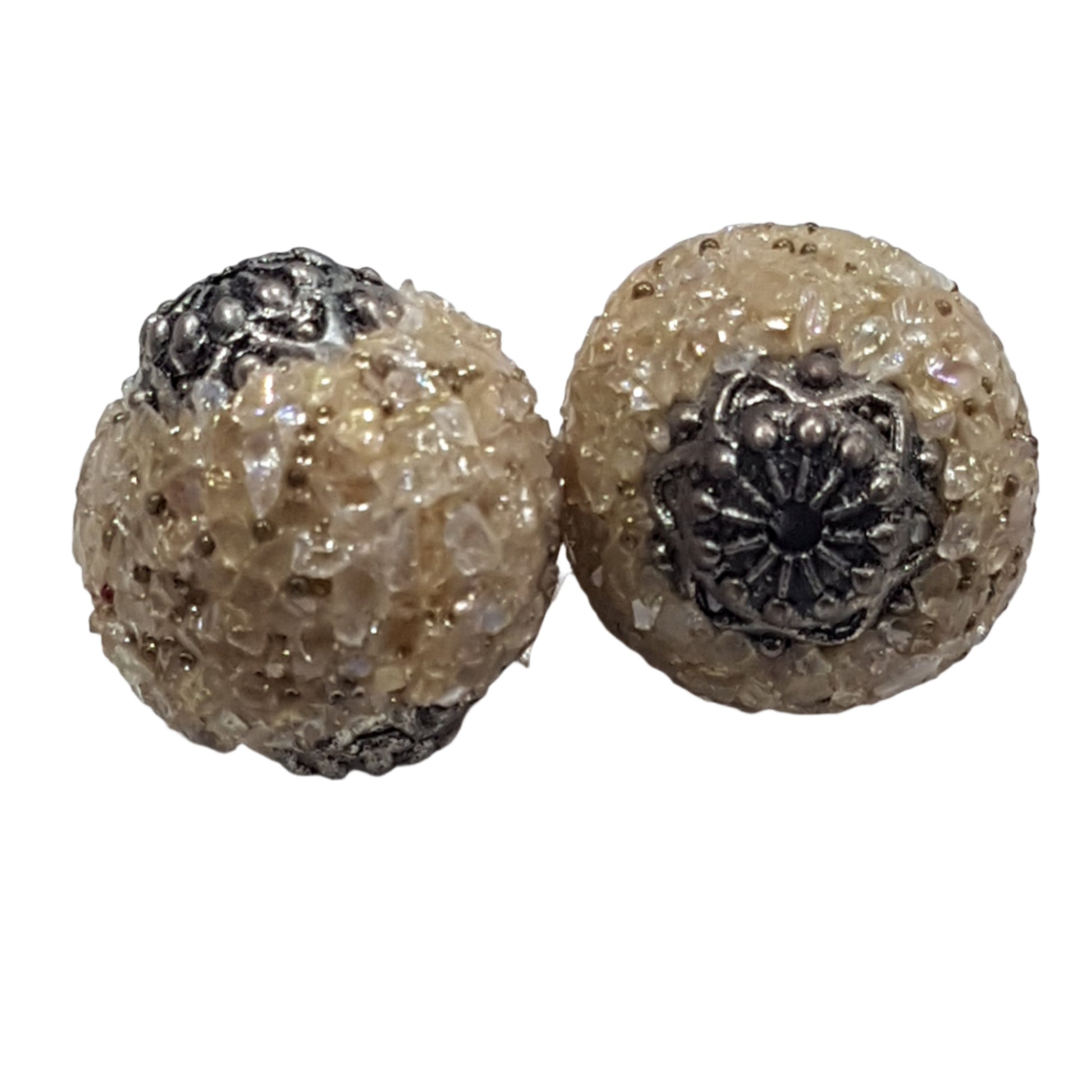 Kashmiri beads are handmade beads of fimo clay and usually decorated with glass microbeads, metal decorations, sequins or rhinestones.