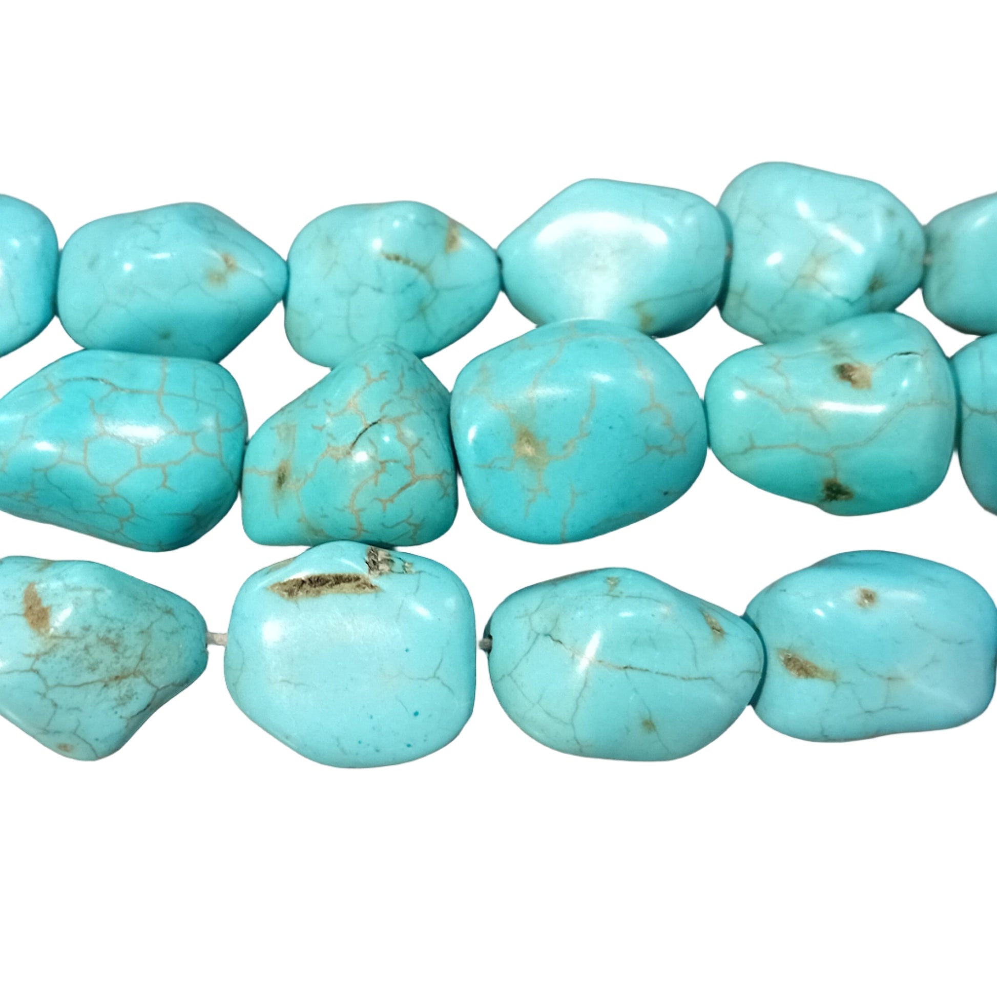 The stone is dyed a range of blue hues, most commonly a bright, robin's egg blue. The color is applied to the surface and may show lighter spots where the dye didn't fully penetrate.
