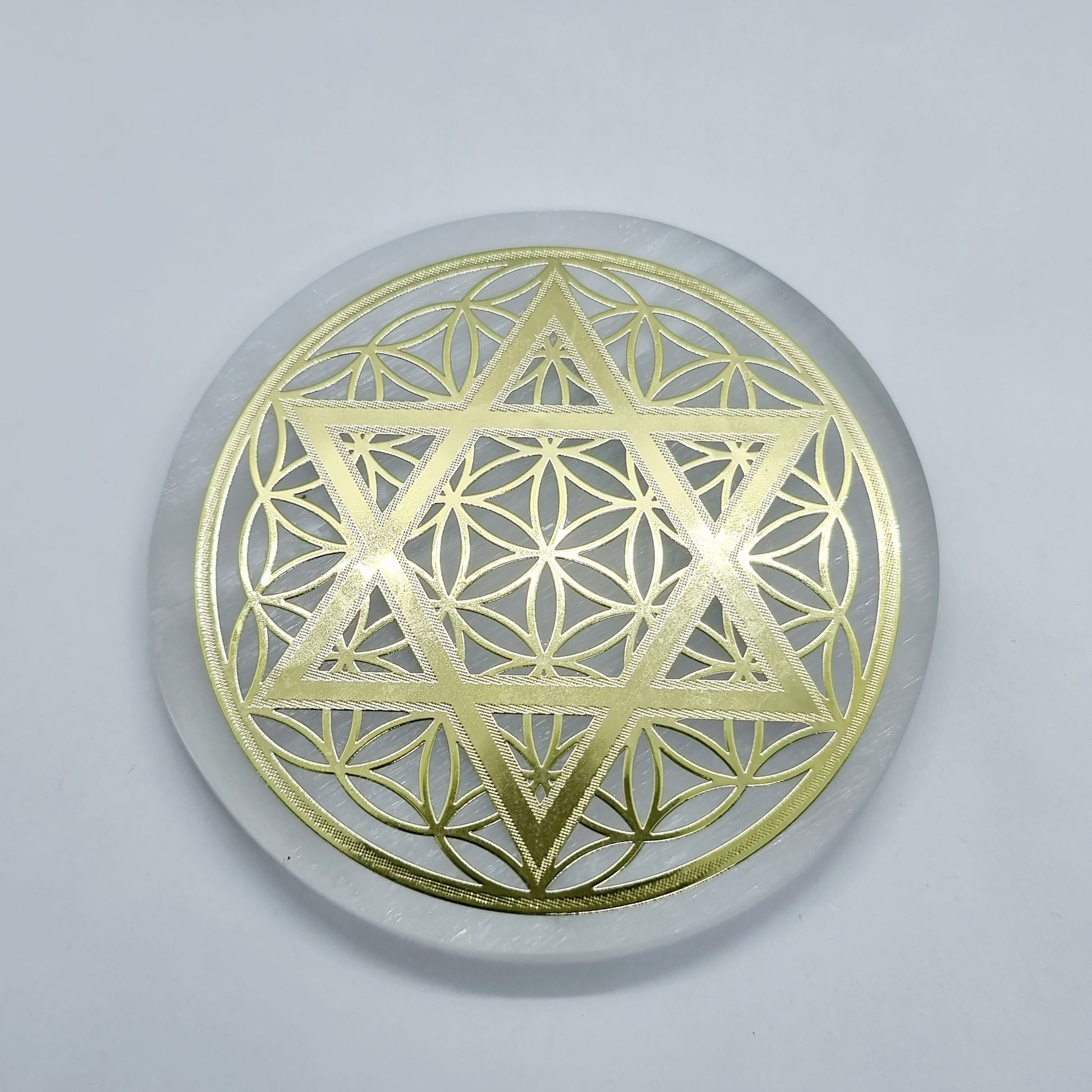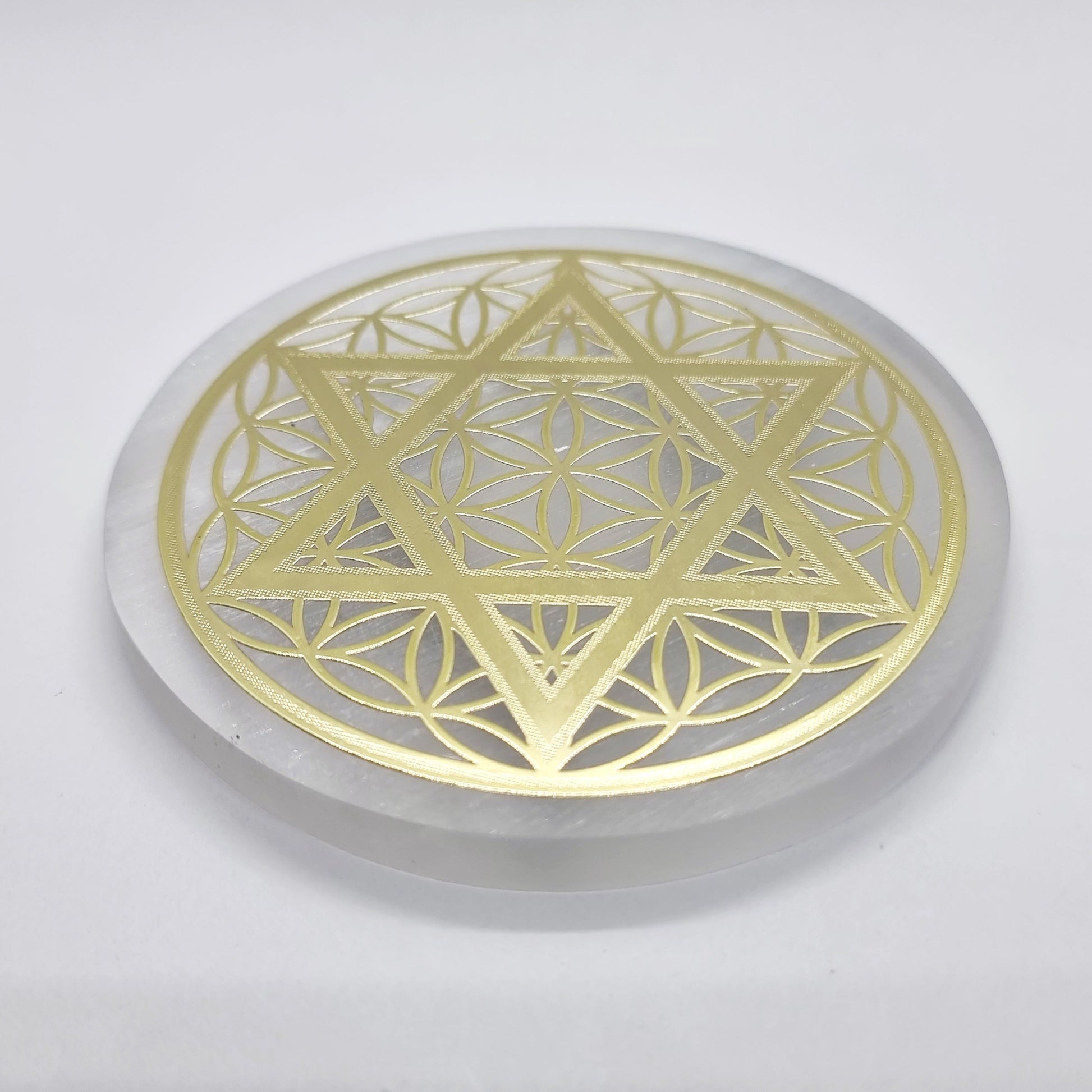 Selenite charging plate with beautiful gold foil design with the flower of life and pentagram symbol.