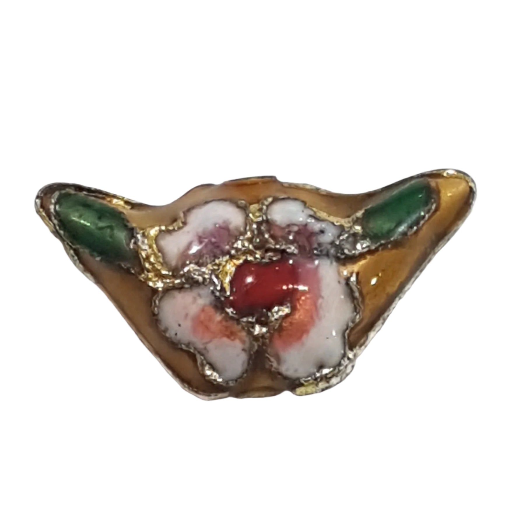 Cloisonné, referred to as ornamental work in which glass, enamel, and/or gemstones, are split into strips of compressed wire which then become placed edgeways on a metal backings, typically found in gold pieces. Cloisonné is a French term also known as partition, originated in the Turkish culture.